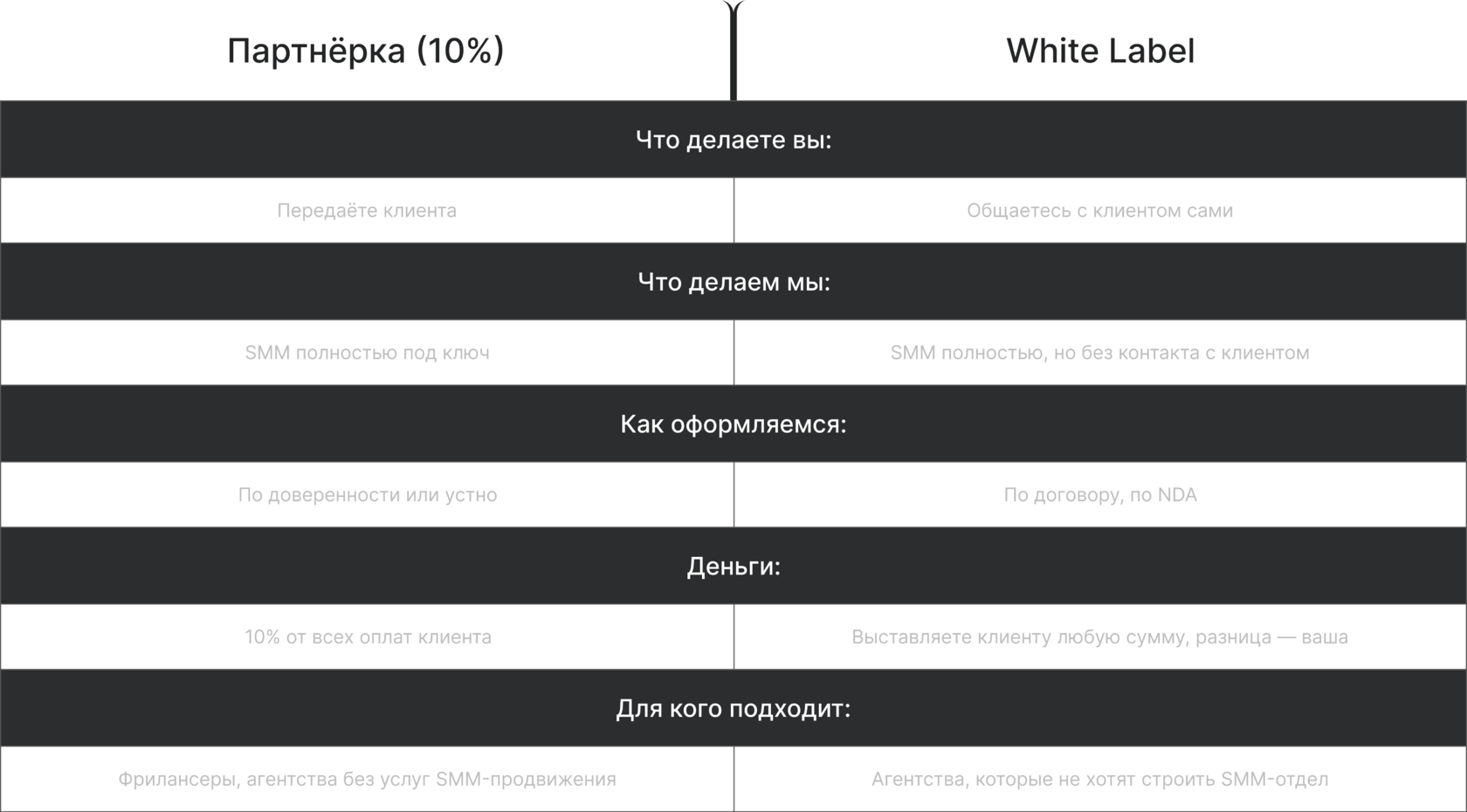 зарабатывать на SMM — просто передавайте клиента или работайте по White Label. Вы выбираете, мы всё делаем. Ваш клиент доволен, вы получаете выплату.